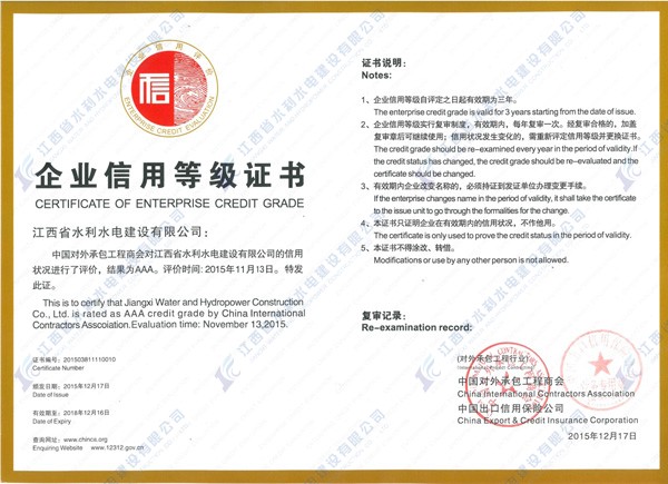 根據(jù)商務(wù)部、國(guó)資委聯(lián)合發(fā)布的《商會(huì)協(xié)會(huì)行業(yè)信用建設(shè)工作指導(dǎo)意見》和《關(guān)于進(jìn)一步做好行業(yè)信用評(píng)價(jià)工作的意見》的要求,結(jié)合承包商會(huì)關(guān)于推進(jìn)行業(yè)信用體系建設(shè)的工作部署,承包商會(huì)于2015年7月啟動(dòng)2015年度對(duì)外承包工程企業(yè)與勞務(wù)合作企業(yè)信用等級(jí)評(píng)價(jià)工作,經(jīng)對(duì)外承包工程企業(yè)與勞務(wù)合作企業(yè)信用等級(jí)評(píng)審委員會(huì)第十一次工作會(huì)議審議,江西省水利水電建設(shè)有限公司被評(píng)定為2015年度對(duì)外承包工程企業(yè)信用評(píng)價(jià)AAA級(jí)信用企業(yè)。