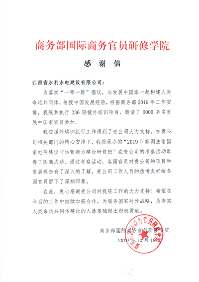 2019年,公司圍繞國家和我省“走出去”戰(zhàn)略,積極配合商務部及省內(nèi)援外培訓工作,得到各方認可。近日,公司收到來自商務部國際商務官員研修學院的感謝信,信中提到,商務部研修學院援外培訓工作得到我公司的大力支持,“2019年非洲法語國家電網(wǎng)建設與運營能力建設研修班”考察、交流活動取得圓滿成功,對公司的積極配合表示衷心感謝。