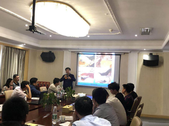 現(xiàn)場參觀結束后,學習團參加了技術培訓和經驗交流會??偨浝碇矶帕柚鞒至碎_班儀式。總工程師胡鴻煌、項目副經理李成,對洋前壩水庫的大壩總布置、大壩施工導流、大壩及供水管道施工技術細節(jié)等,通過文字、圖片、視頻等組成的PPT課件為學員授課,并就學員提出的問題逐一進行了解答。