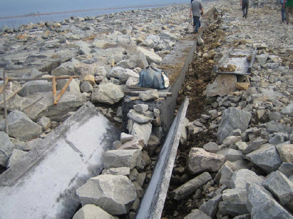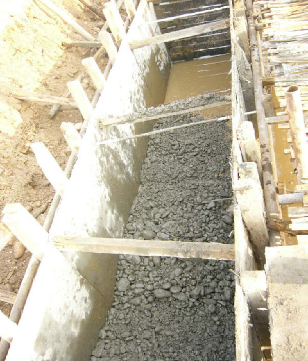基坑開挖:驗(yàn)收前,施工單位應(yīng)對地下水或地表水作妥善引排或封堵,清理積渣雜物,作好高程、軸線的測量復(fù)核、記錄,并設(shè)樁拉線。驗(yàn)收合格后,方可安排砌石或澆筑混凝土。