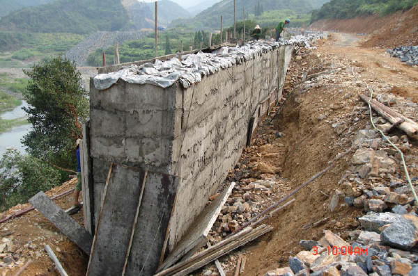 擋墻砌筑應(yīng)分層,每一砌筑層擺石時均應(yīng)座漿,隨鋪漿隨砌筑。嚴(yán)禁石塊大面無漿直接貼靠?;炷帘仨氂谜駬v器逐縫振搗。當(dāng)豎縫寬度在5cm以上時,可填漿后塞片石。嚴(yán)禁先堆砌石塊再用膠結(jié)料灌縫。