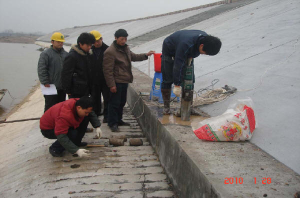 ※ 重點(diǎn)檢查水庫的險情是否已按設(shè)計要求給予消除;工程質(zhì)量是否按規(guī)定檢驗(yàn),各項(xiàng)檢測數(shù)據(jù)是否滿足設(shè)計要求或相關(guān)標(biāo)準(zhǔn):土方的壓實(shí)度、滲透系數(shù);混凝土(含預(yù)制塊)的抗壓強(qiáng)度、抗凍、抗?jié)B、彈性模量;砂漿的抗壓強(qiáng)度;灌漿的壓水試驗(yàn)結(jié)果(透水率Lu):固結(jié)灌漿≮5%、帷幕灌漿≮10%。