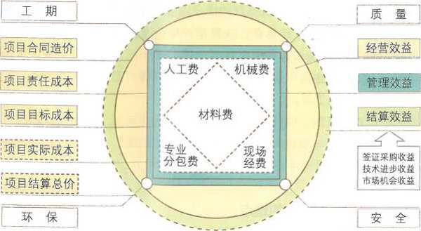 “方圓圖”是具有操作性的工具。其一,“方圓圖” 完整詮釋了建筑項(xiàng)目管理行為間的關(guān)系?!敖禹?xiàng)目”確定了合同造價(jià),對(duì)應(yīng)方圓圖的實(shí)線圓;“做項(xiàng)目”的第一步是下達(dá)項(xiàng)目目標(biāo)責(zé)任書,確定項(xiàng)目責(zé)任成本,對(duì)應(yīng)方圓圖的責(zé)任成本方形,第二步分子公司在責(zé)任書的基礎(chǔ)上進(jìn)行項(xiàng)目實(shí)施策劃,產(chǎn)生項(xiàng)目的目標(biāo)成本,對(duì)應(yīng)方圓圖的目標(biāo)成本方形,第三步就是項(xiàng)目實(shí)施過程的管控,最終確定實(shí)際成本,對(duì)應(yīng)方圓圖的實(shí)際成本方形?!八阗~收錢”就是完成項(xiàng)目過程中的結(jié)算變更與最后的決算收款,從而確定結(jié)算造價(jià),對(duì)應(yīng)方圓圖的結(jié)夢(mèng)造價(jià)虛線圓。項(xiàng)目實(shí)施過程中進(jìn)度、質(zhì)量、安全、環(huán)保及周邊相關(guān) 方的管理對(duì)應(yīng)成本方形的四個(gè)支撐頂點(diǎn),構(gòu)成成本的五項(xiàng)費(fèi)用“材料、人工、機(jī)械、現(xiàn)場(chǎng)經(jīng)費(fèi)、專業(yè)分包”對(duì)應(yīng)成本方形的內(nèi)部區(qū)域。