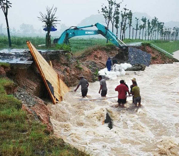 進(jìn)入7月以來,昌江河流域普降暴雨,橋溪水河水位大漲。7月7日,公司接到業(yè)主汛情通報(bào),已完工驗(yàn)收工程多處出現(xiàn)險(xiǎn)情;汛情就是命令,時(shí)間就是生命,公司迅速組建了一支裝備精良、經(jīng)驗(yàn)豐富的專業(yè)搶險(xiǎn)突擊隊(duì),由副總經(jīng)理曾朝文、總經(jīng)理助理杜凌帶隊(duì),連夜奔赴浮梁抗洪一線,組織設(shè)備、人員、材料進(jìn)場,進(jìn)行搶險(xiǎn)救災(zāi)工作。