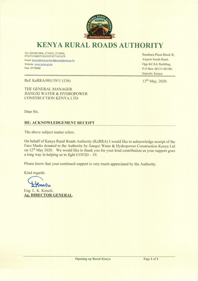 收到來自江西水建捐贈(zèng)的防疫物資后,肯尼亞鄉(xiāng)村公路局局長由衷地表示感激,并向肯尼亞分公司寫了一封感謝信,他在信中表示:“江西水建友好慷慨的捐贈(zèng),將為我們對(duì)抗新冠肺炎疫情提供長遠(yuǎn)的支持,肯尼亞鄉(xiāng)村公路局對(duì)此深表感激?!?